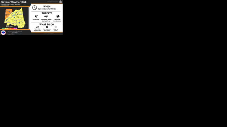 The National Weather Service has issued a risk 2 severe weather risk from 9 p.m. Sunday until 7 a.m. Monday for Tallapoosa, Elmore and Coosa counties.Â