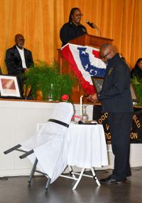 Goodwater Disabled Veterans Organization Sergeant at Arms Earl Spivey lights the lone candle on the fallen comrade table during the group's annual Veterans Day program.