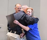 Supply coordinator Nancy McClanahan, right, receives a hug from Deputy Chief James Easterwood during the Alexander City Police Department's retirement ceremony Wednesday afternoon.