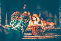 Feet in woollen socks by the Christmas fireplace. Woman relaxes by warm fire with a cup of hot drink and warming up her feet in woollen socks. Close up on feet. Winter and Christmas holidays concept.