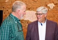 Tallapoosa County Coroner Mike Knox, left, talks with Radney Funeral Home owner Randy Anderson during the Tallapoosa County Republican Party's meet and greet Thursday night.