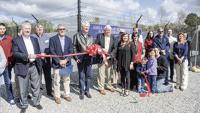 Alexander City Mayor Jim Nabors, center, cuts the ribbon on the AMEA solar panel research facility on Dadeville Road Thursday morning. The panels produce 50 kilowatts daily, enough to power five to seven average-sized homes.