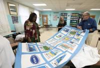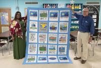 Cliff Williams / The Outlook Stephens Elementary School assistant principal Lekisha Richardson and John Thompson hold a quilt with the first 10 T-shirts created for the annual cleanup.