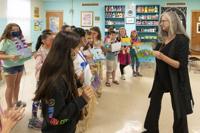 Cliff Williams / The Outlook Stephens Elementary School Debra Griffith speaks with students who participated in the LMRA annual clean up T shirt design.