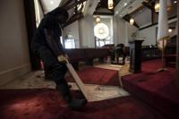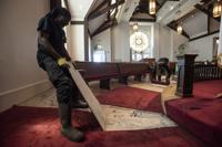 Cliff Williams / The Outlook Zachary McCall with ServePro removes carpet from First United Methodist Church Thursday. Some of the water from fighting the fire in the bell tower made its way into the church.