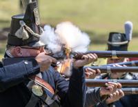 On Saturday, hundreds of history buffs gathered at Horseshoe Bend National Military Park for the 212th anniversary of the Battle of Horseshoe Bend. The evening closed out with luminaries on the battlefield representing lives lost. Clockwise from the top, reenactors representing Andrew Jackson's troops fire flintlock muskets, which produce lots of sparks and smoke; Jake Tiger, from Seminole, Oklahoma hangs stickball equipment that represents one of the Muscogee Creek villages near the Horseshoe Bend before a stickball game; and Rosa Hall provided visitors with insight into the lifestyles and cultures of the early 1800s. Here she was speaking about Muscogee Creek rattles made of hundreds of deer hooves tied to deerskin leggings that female dancers wore to make loud sounds as they danced.