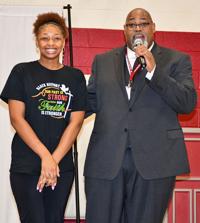 Gwen Bishop / TPI Miles College Marching Band director Willie Snipes, Jr., with his daughter Emma, a student at Alexander City Middle School, before the school's drumline performed at the Alexander City Middle School Black History Month program.