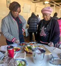 Two participants of the Right Bite nutrition education series design a healthy charcuterie board during the last class at the Goodwater Youth Development and Recreational Center.