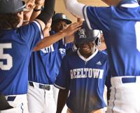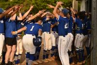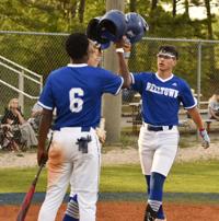 Andy Anders / The Outlook Reeltown senior Gabe Bryant taps his helmet with a pair of teammates after blasting a two-run home run Tuesday.