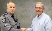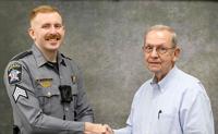 Tyler Williams, left, congratulated by Tallapoosa County Sheriff Jimmy Abbett on his promotion.