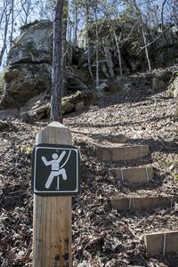 The climbing area is identified with signage and wooden steps. Photo by Kenneth Boone