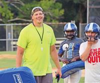 Former Stanhope Elmore offensive lineman Adam Durham laughs with the kids at New Life Christian Academy’s football practice Thursday. Photo by Cory Diaz