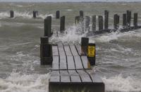 Rough seas batter a pier at the Seabrook Sailing Club as Hurricane Harvey approaches the Texas coast Friday, Aug. 25, 2017.