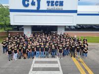 C & J Tech Alabama Inc. employees stand with Dadeville in their Dadeville Strong shirts that were purchased from Xpress Yourself, which is donating the shirt proceeds to Dadeville High School.