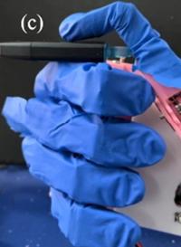 Pressure sensors are placed at the fingertips of the prosthetic hand, and a camera near its palm (left). The prosthetic hand was tested on a can (a), an egg (b), and a USB stick (c). (Hua Li via SWNS)