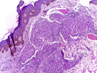 Section of skin showing epithelioid granulomas in the dermis and reduction in the number of appendages. (Department of Pathology, Calicut Medical College via Wikimedia Commons)