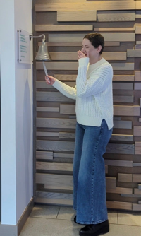 Evelina Rydzanicz rings the bell, signaling she is cancer-free. (Evelina Rydzanicz/Breast Cancer via SWNS)