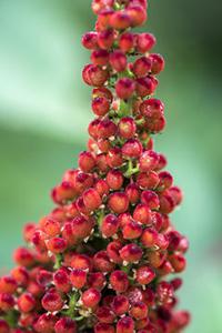Smooth Sumac is beautiful in both form and color. It can grow up to 20 feet tall and has a long, leaning trunk or multiple trunks with grayish-brown bark and an open crown. Pinnate and compound, Smooth Sumac leaves are large, fern-like constructions with smooth green or purple stems supporting pairs of shiny, dark green, lance-shaped leaflets and a single terminal leaflet. Each leaf is between 1 and 1-1/2 feet long and contains 11 to 31 leaflets. Leaflets all have shallow, toothed edges.