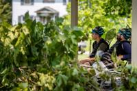 James Moyle, left, and Frank Arch sit in a shelter at Miller Park next to a pile of tree debris on Tuesday. They were dressed as flies for an event in the park by Mandela Elementary. A storm over the weekend damaged thousands of trees and knocked out power in the Omaha area.