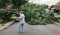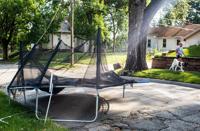 Sara Smith walks her dog Ellie south on 45th Street towards Poppleton Avenue next to a trampoline that blew out of a neighboring yard and appeared to have hit a power line before coming to rest on a speed bump after an overnight storm caused power outages and tree damage in the area on Saturday.