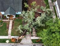 A tree fell on a house near 45th and Mayberry Streets after an overnight storm on Saturday. More than 65,000 people remained without power Sunday morning, about 36 hours after the storm, which brought hurricane-force winds, ripped through the Omaha area.