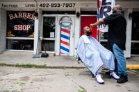 Courtney Hudson, 42, of Omaha gets his hair cut by owner Mark Nelson outside Another Level Barbershop during a power outage Saturday.