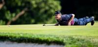 Joakim Haeggman lays down before putting on the third green during the second round of the U.S. Senior Open Championship on Friday.