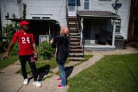 Tony Jackson, 61, and Tammy Kozak, 46, chat on outside Jackson's apartment in Omaha. Jackson's power was restored Sunday night. "I love camping," he said. "I just find something positive in the negative. My prayer is that everybody is safe and sound."