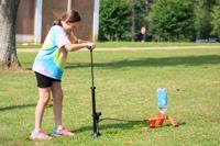 As part of the science station, kids work to set up the bottle rocket. In a few minutes the bottle will be ready to launch.