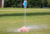 After giving the bottle some air with a pump and pulling the string, the rocket launches off.