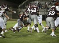 Cliff Williams / The Outlook Ben Russell lineman Gavyn Vickers brings down Huffman’s Mekail Alexander-JohnsonFriday at the Charles E. Bailey Sportplex.