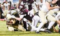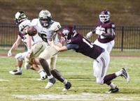 Lizi Arbogast / The Outlook Benjamin Russell's Hezekiah Hunter (23) is wrapped up by Wetumpka's Hezekiah Nowden.