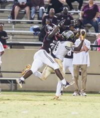 Lizi Arbogast / The Outlook Wetumpka's Malik Davis hauls in a pass while being defended by Benjamin Russell's Denzel Green (5).