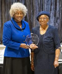 Cliff Williams / TPI Hertisene Crenshaw, right, accepts the W.B. Doby Award from Idell Gill at Sunday’s Elmore County Civic Improvement League banquet.