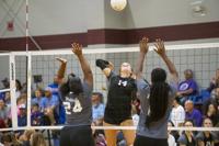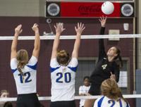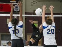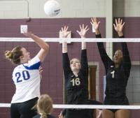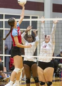 Cliff Williams / The Herald Elmore County’s Isabella Fuller (5) tries to hit through the Prattville block.