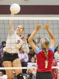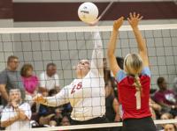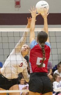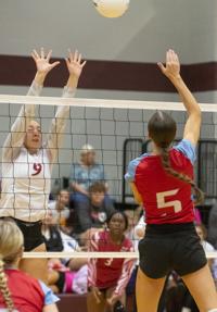 Cliff Williams / The Herald Horseshoe Bend’s Reagan Taylor (5) looks for a kill against Stanhope Elmore’s Alyssa Ward (28).