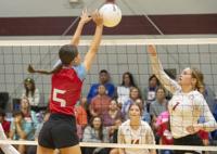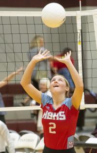 Cliff Williams / The Herald Horseshoe Bend’s Jacey Johnson (2) sets against Stanhope Elmore.