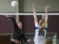 Cliff Williams / The Herald Elmore County’s Morgan Spear (1) looks for the kill against Prattville.
