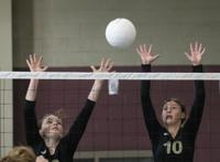 Cliff Williams / The Herald Wetumpka’s Hannah Kate Burdett (16) and Charley Labriola (10) looks for the block against Beauregard.