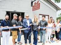 Wetumpka Mayor Jerry Willis, center, cuts the ribbon Friday on the new George’s River Market & Butchery shop located at 201 Spring St. in downtown Wetumpka. Joining in the ceremony were, from left, Wetumpka Chamber of Commerce vice president Scott Grier, co-owners Chris George and Carissa George, Willis, co-owners Brooklyn George and Dillon George, Wetumpka chamber president Tracy Hart, Main Street director Jenny Stubbs, Elmore County Commissioner Troy Stubbs and Wetumpka chamber director Shellie Whitfield. George’s is the only farm-to-market butcher shop in the county, as most of the fresh-cut beef, pork and lamb is raised on the family’s 400-acre farm in Eclectic. The shop also sells produce, canned and baked goods. The Georges have been involved in raising livestock for more than 50 years.