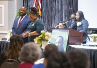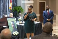 Cliff Williams / TPI Desirae Lewis-Jackson, left, speaks briefly after receiving the Percy Gill Visionary Award at Sunday’s Living the Dream Program. She said Gill encouraged her to help the community through politics.