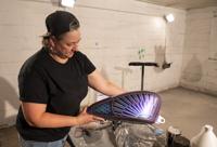 Cliff Williams / The Herald Clara Hall, a Coast Guard veteran, looks over a motorcycle gas tank she painted. Almost weekly Hall works on motorcycles in the Kent community as part of Operation Charlie Bravo.