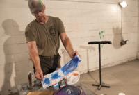 Cliff Williams / The Herald Air Force veteran Rob Dinsmore shows one of the templates Clara Hall, a Coast Guard veteran, used as she painted a motorcycle gas tank.