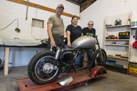 Cliff Williams / The Herald Rob Dinsmore, left, Clara Hall and Tracy Metcalf pose around Hall’s motorcycle. Hall is building on the frame of a 1980 Honda Goldwing but when she is finished it will look like a bobtail Harley Davidson.