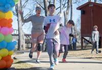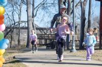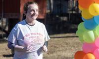 Ana Sofia Meyer / TPI At the 11th annual Paint the Park for Jody event, two finishers raise their arms above their heads in celebration as they pass through the colorful balloon arch.