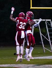 Jake Arthur/ Wetumpka Herald Stanhope Elmore wide receiver Jackson Thomas (5) celebrates a touchdown during an AHSAA football game between the Stanhope Elmore Mustangs and the Selma Saints at Stanhope High School in Millbrook, Ala on Friday, Aug. 20, 2021. The touchdown will be called back due to a block in the back call. Stanhope won the game 37-0. [Alex City Outlook/ Jake Arthur]