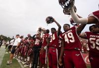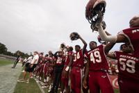 Jake Arthur/ Wetumpka Herald Stanhope Elmore players hold up their helmets before kickoff of an AHSAA football game between the Stanhope Elmore Mustangs and the Selma Saints at Stanhope High School in Millbrook, Ala on Friday, Aug. 20, 2021. Stanhope won the game 37-0. [Alex City Outlook/ Jake Arthur]