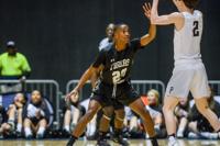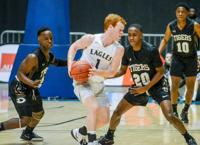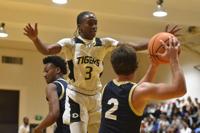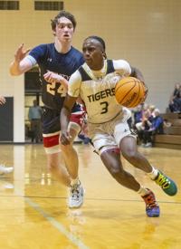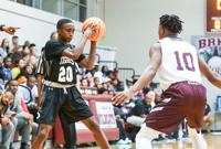 Caleb Turrentine / The Outlook Providence Christian’s Hayes Lewis is guarded by Dadeville’s Phil Dowdell (20) and DaQuan Doss (12).