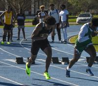 Dadeville senior Phil Dowdell ducks his head as he begins his 100m dash, finishing first, on March 13, 2023. Madison Academy, Montgomery, AL.