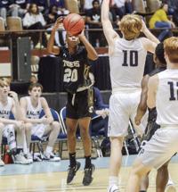 Caleb Turrentine / The Outlook Dadeville’s Phil Dowdell (20) shoots a 3-pointer over Providence Christian’s Collins McClintock during the Class 3A Southeast Regional semifinals on Saturday.